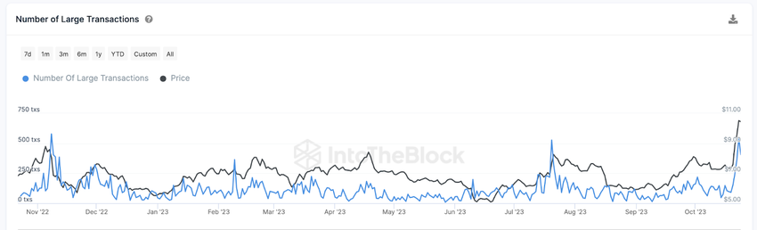 Secondo IntoTheBlock, come illustrato nel grafico di IntoTheBlock qui sotto, la rete Chainlink ha registrato 544 e 406 transazioni di balene rispettivamente il 23 e il 24 ottobre. Ciò significa che Chainlink ha attirato 950 transazioni whale negli ultimi due giorni.