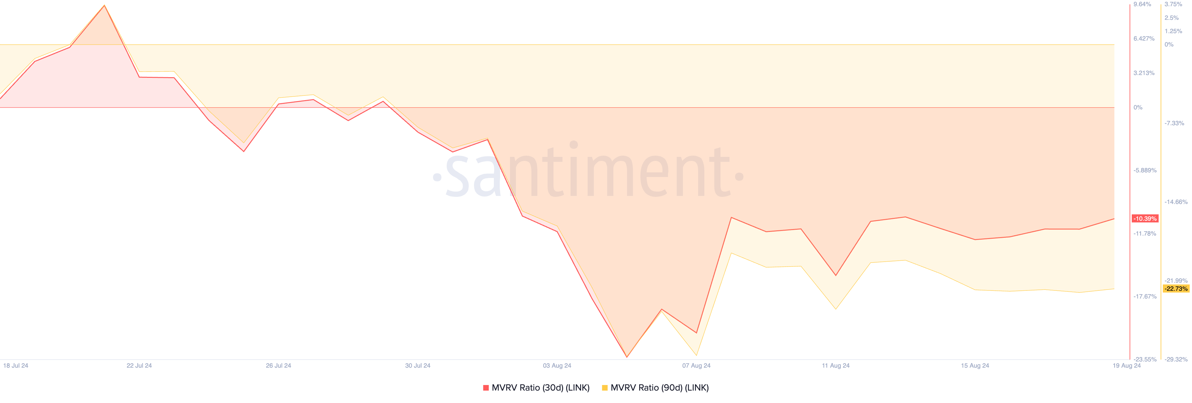 Il rapporto tra valore di mercato e valore realizzato (MVRV) di LINK, valutato su diverse medie mobili, ha dato segnali di acquisto. Al momento della stampa, i rapporti MVRV a 30 e a 90 giorni del token sono rispettivamente -10,39 e -22,73.