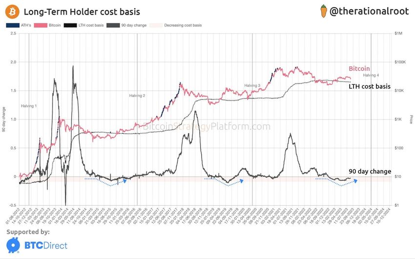 Inoltre, l’analista disegna un grafico della variazione a 90 giorni di questo indicatore per illustrare ulteriormente il periodo di accumulo tra un mercato toro e un mercato toro (frecce blu). Il periodo di rimbalzo sembra essere iniziato e il prezzo del BTC è ben al di sopra della base di costo dei detentori a lungo termine. In conclusione, @theratinalroot scrive:
