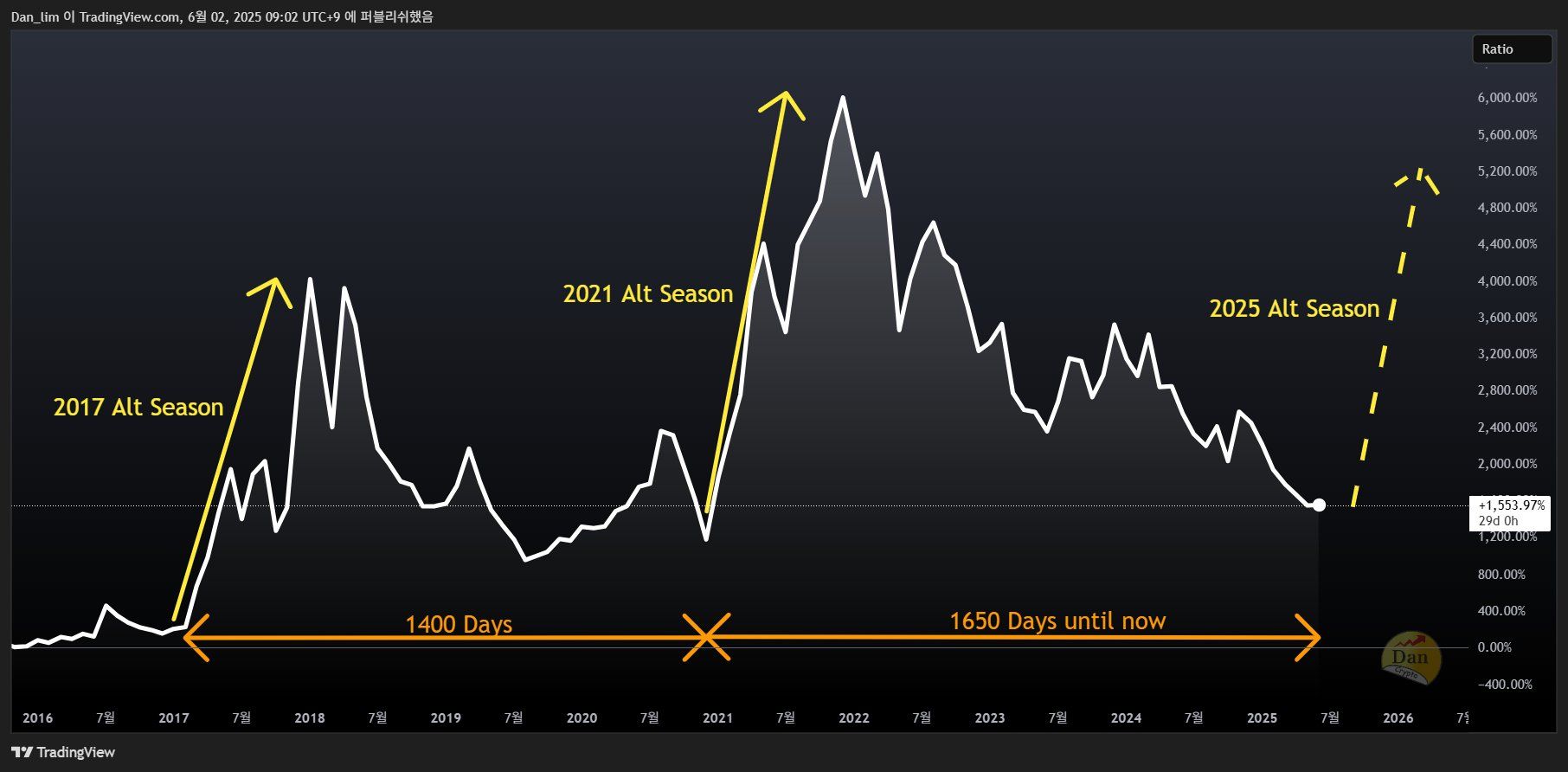 Allo stesso modo, l’analista Crypto Dan sottolinea che l’attuale ciclo delle altcoin si è esteso a 1.650 giorni. È molto più lungo del ciclo precedente, che tipicamente vedeva un’altseason dopo circa 1.400 giorni.