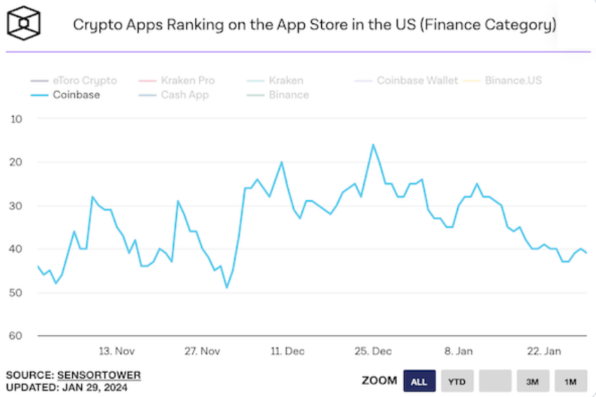 Un importante dirigente di criptovalute ha sottolineato il motivo per cui l’applicazione per il piattaformadiscambio di criptovalute Coinbase sta diminuendo significativamente di popolarità sull’App Store di Apple.