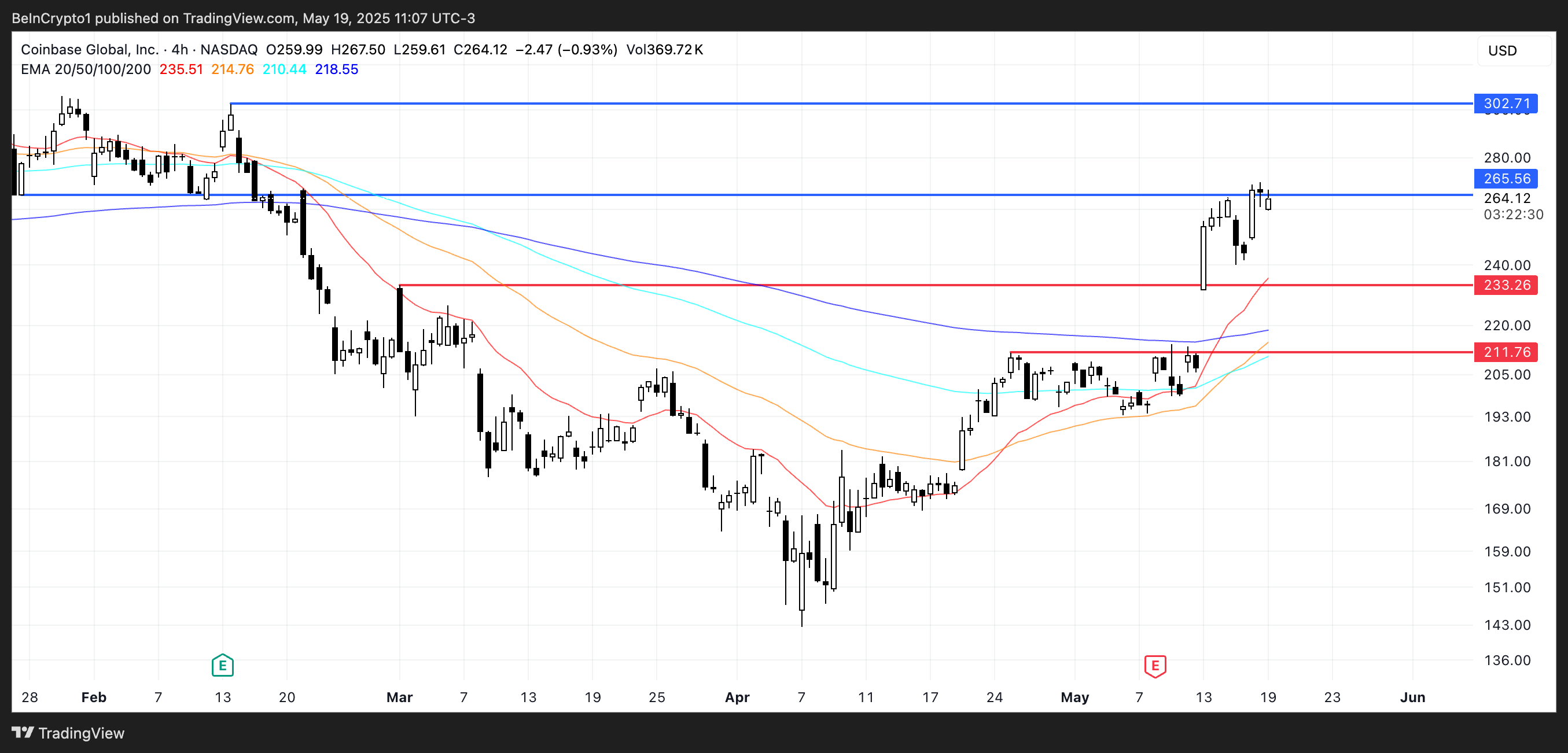 Tecnicamente, COIN affronta resistenza vicino a $265, con le linee EMA rialziste ancora intatte.
