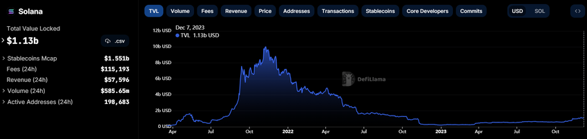 Nonostante queste tendenze positive, l’ecosistema Solana è ancora indietro rispetto a Ethereum in termini di attività complessiva. Tuttavia, la recente impennata delle attività DeFi (finanza decentralizzata), in parte guidata dagli annunci di airdrop, ha portato a un aumento del 47% del TVL (valore totale bloccato) di Solana da novembre. Attualmente, il TVL si attesta a 1,19 miliardi di dollari, allineandosi alle cifre precedenti al crollo del FTX.