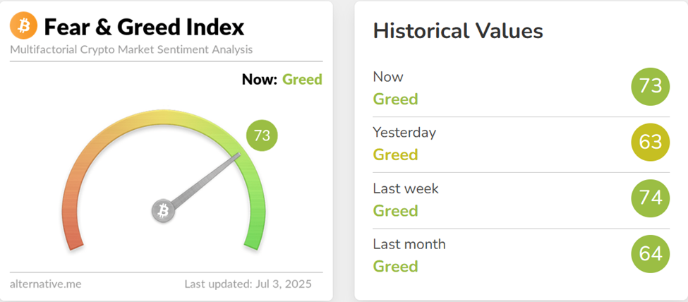 Questo aumento della domanda istituzionale coincide con una lettura dell’Indice Fear & Greed di 73, al momento della pubblicazione. L’indice colloca il mercato saldamente nel territorio della “Avidità”, una prospettiva che è persistita nelle ultime settimane.