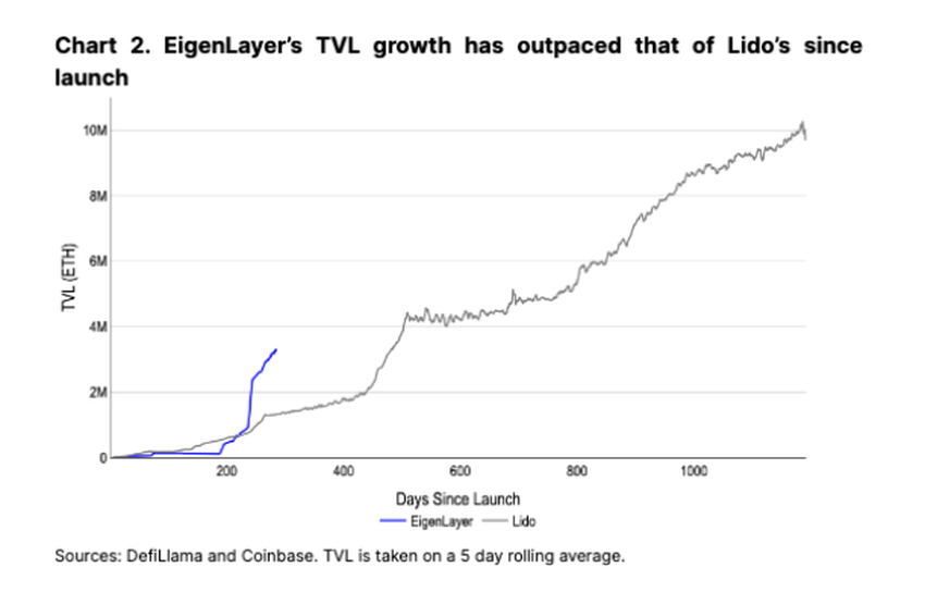 SponsoredEigenLayer ha registrato una crescita esplosiva nonostante la mancanza di servizi convalidati attivamente (AVS) – i protocolli aggiuntivi che i validatori possono garantire per aumentare le ricompense. Ciò suggerisce che le opportunità di coltivazione a breve termine potrebbero suscitare un certo interesse. Gli analisti di Coinbase prevedono un calo a breve termine del TVL di EigenLayer quando l’attività di farming terminerà o se i rendimenti AVS iniziali saranno deludenti.