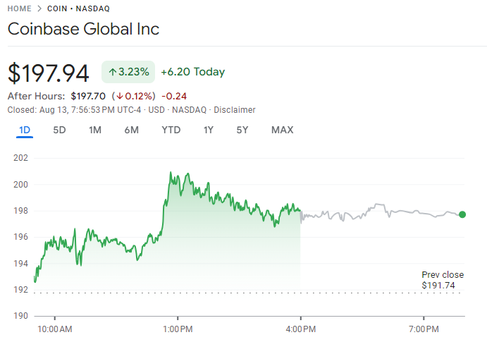 Questa mossa sembra avere un impatto positivo sulle azioni di Coinbase. Dopo l’annuncio, COIN ha registrato un aumento da 194,60 dollari a 201,10 dollari, chiudendo a 197,94 dollari. Questo segna un aumento del 3,23% per il periodo di scambiare di ieri.