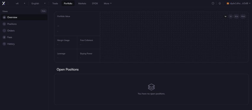 Una volta connesso, puoi esplorare l’interfaccia di dYdX Chain: