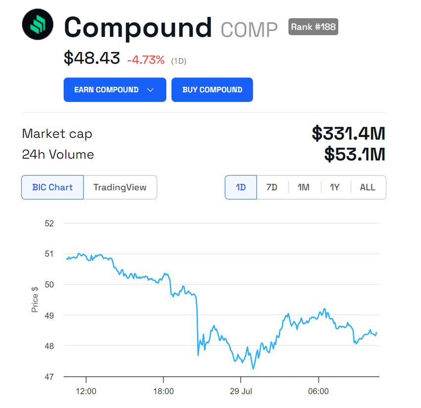 La controversia sulla Proposta 289 ha portato a un notevole calo del token nativo di Compound, COMP. Al momento in cui scriviamo, scambia a 48,43 dollari, segnando un calo del 4,73% nelle ultime 24 ore.