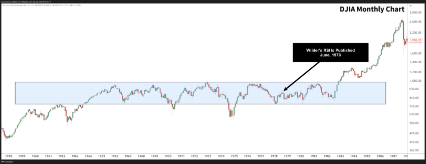 Nel 1978, J. Welles Wilder ha introdotto l’RSI. All’epoca, era rivoluzionario. Perché? Perché l’RSI prospera nei mercati in range, esattamente ciò che gli investitori hanno sperimentato durante il periodo di Wilder: