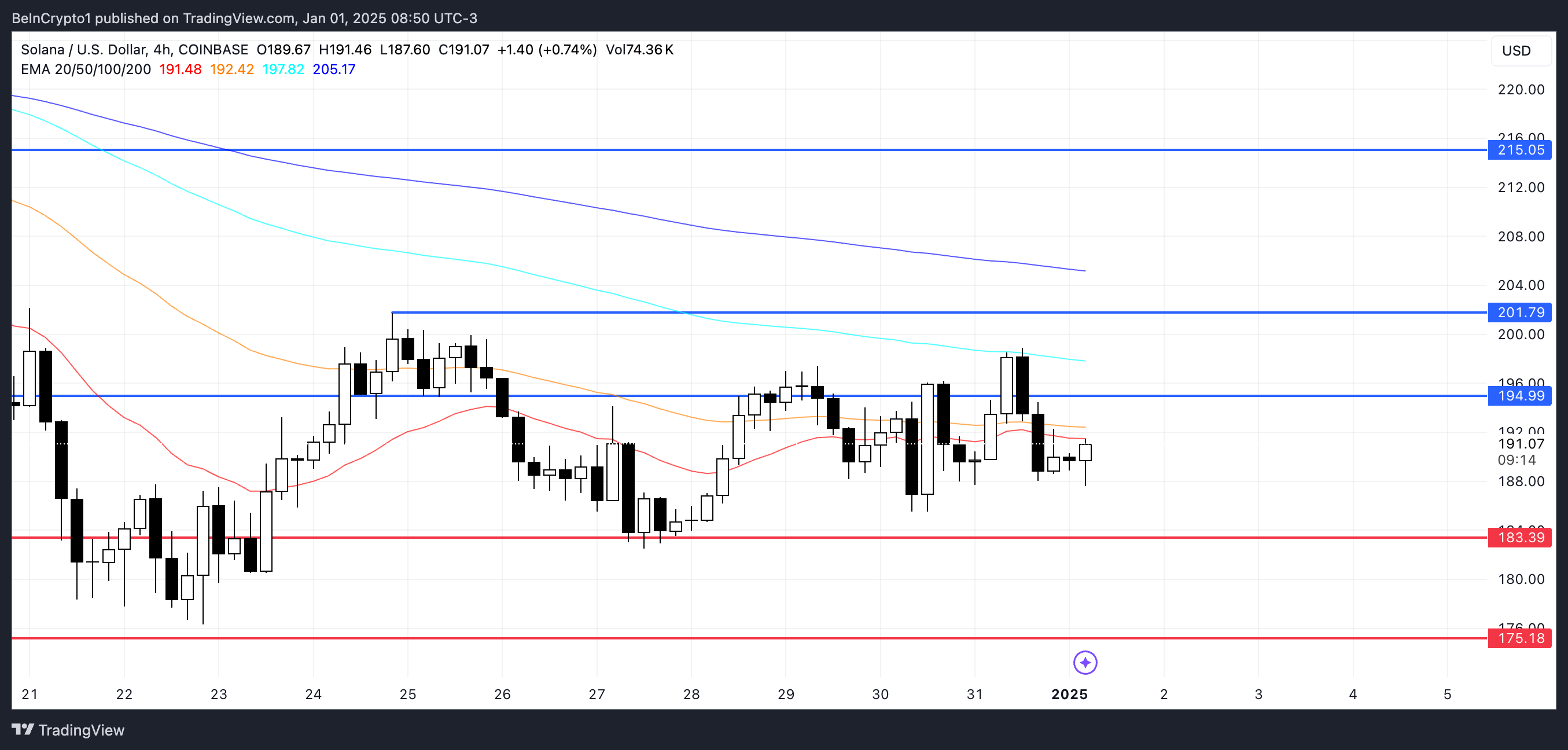 Le linee EMA di SOL indicano un setup ribassista, anche se la mancanza di una forte tendenza al ribasso suggerisce una potenziale stabilizzazione. I livelli chiave a 183 USD di supporto e 194 USD di resistenza probabilmente determineranno se SOL continuerà a consolidarsi o farà una mossa decisiva a breve termine.