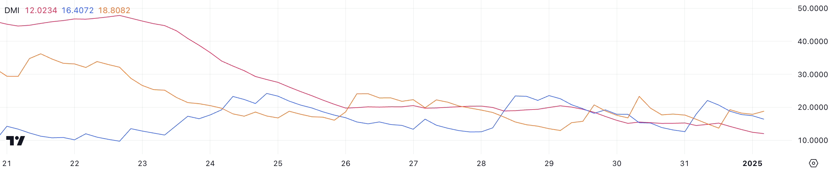 Con entrambi gli indicatori direzionali (D+ e D-) relativamente vicini, il grafico mostra una mancanza di chiara dominanza, sebbene D- a 18,8 superi leggermente D+ a 16, mantenendo un bias ribassista.