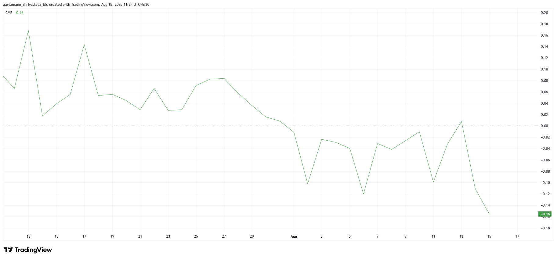 L’indicatore Chaikin Money Flow (CMF) mostra che il sentiment degli investitori verso HBAR è attualmente ribassista. Il CMF ha raggiunto un minimo di due mesi, segnalando che i deflussi stanno dominando l’asset. Questo calo nel CMF suggerisce che molti detentori di HBAR stanno vendendo le loro posizioni mentre il prezzo si consolida, spingendo gli investitori a garantire i loro guadagni.