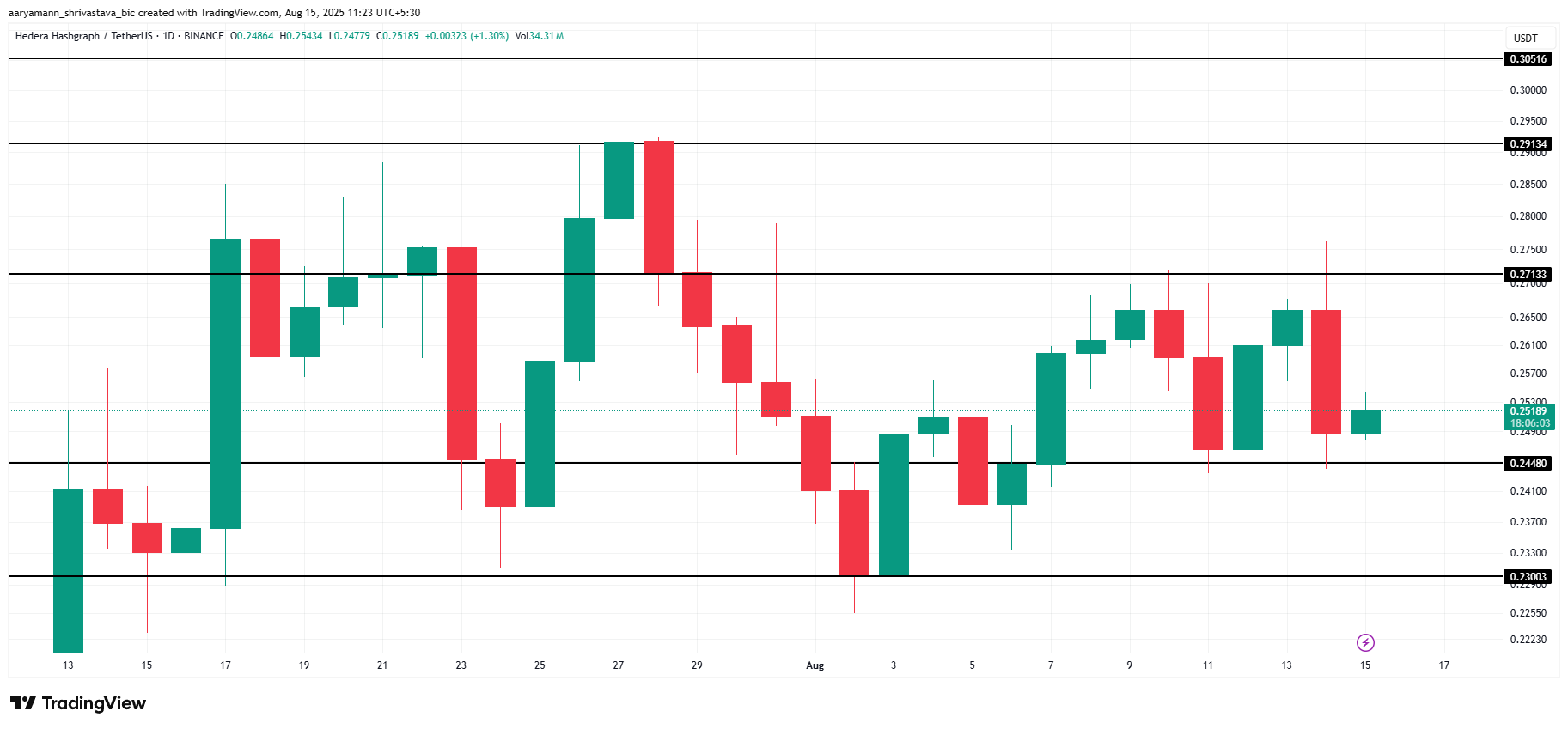 HBAR ha recentemente sperimentato un movimento laterale, rimanendo bloccato tra $0,244 e $0,271.