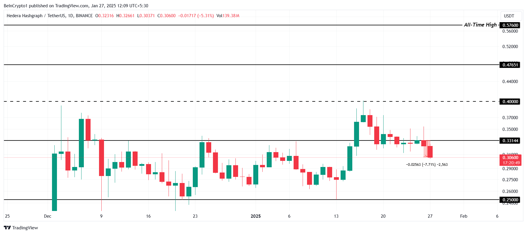 Attualmente scambiato a 0.30 USD, HBAR è sceso del 7% nelle ultime 24 ore. La criptovaluta è ora tornata nella sua gamma di consolidamento di 0.33 USD a 0.25 USD dopo non essere riuscita a garantire 0.33 USD come livello di supporto. Questo scivolone ha riacceso le preoccupazioni sulla traiettoria a breve termine dell’altcoin.