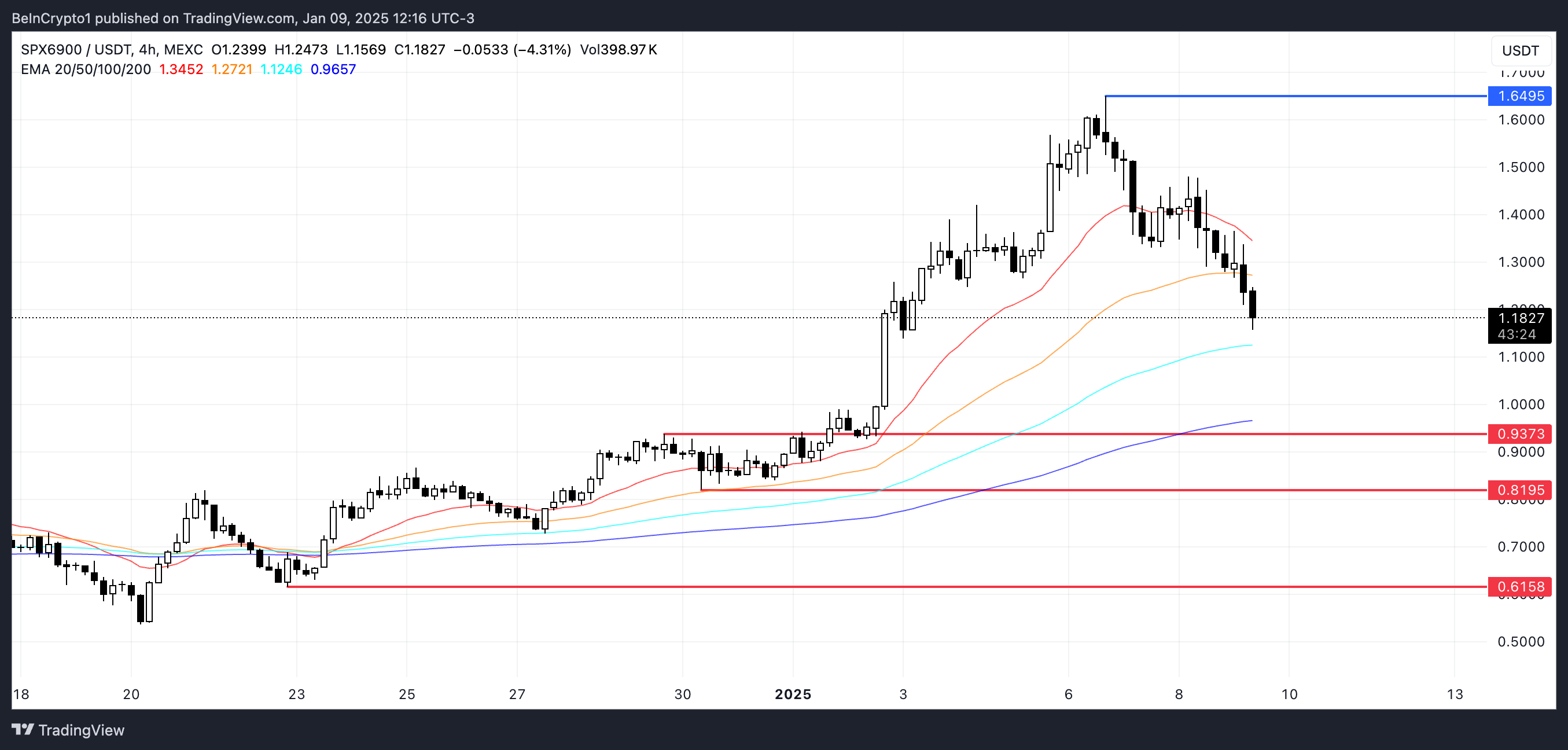 Se l’RSI scende ulteriormente o si stabilizza vicino a 30, potrebbe creare condizioni per un recupero del prezzo poiché l’interesse di acquisto potrebbe tornare. Tuttavia, senza un forte cambiamento nel sentimento del mercato, il prezzo di SPX potrebbe continuare a consolidarsi o a scendere nel breve termine, come altri memecoin.