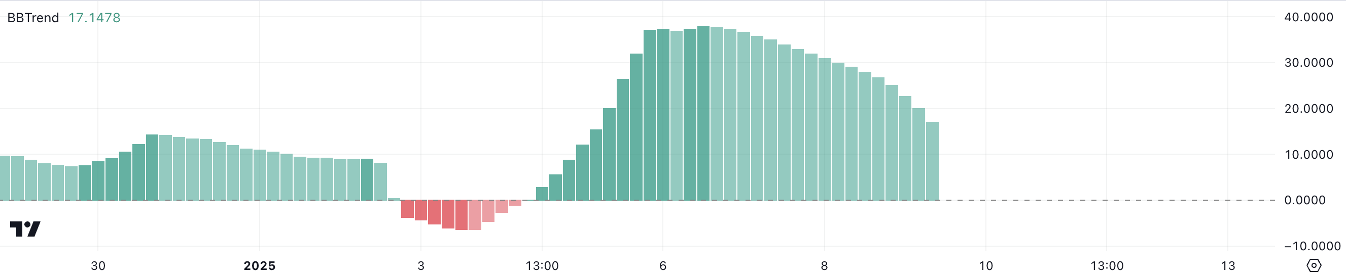 Il BBTrend di SPX rimane positivo a 17.1 nonostante un calo costante dal suo recente picco di 38 il 6 gennaio. Derivato dalle Bande di Bollinger, il BBTrend misura la forza e la direzione di un trend di prezzo. Valori positivi indicano momentum rialzista, mentre valori negativi suggeriscono condizioni ribassiste.