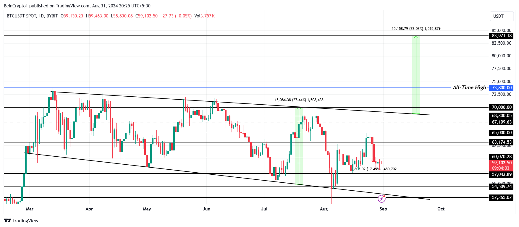 Ci sono due esiti per il prezzo del Bitcoin a settembre. Il primo è un approccio più pratico basato su segnali recenti, che suggerisce che il BTC rimarrà sotto i 68 300 USD. Questa barriera ha impedito più volte al re delle cripto di fare breakout e, considerando le condizioni ribassiste, ciò potrebbe accadere di nuovo.