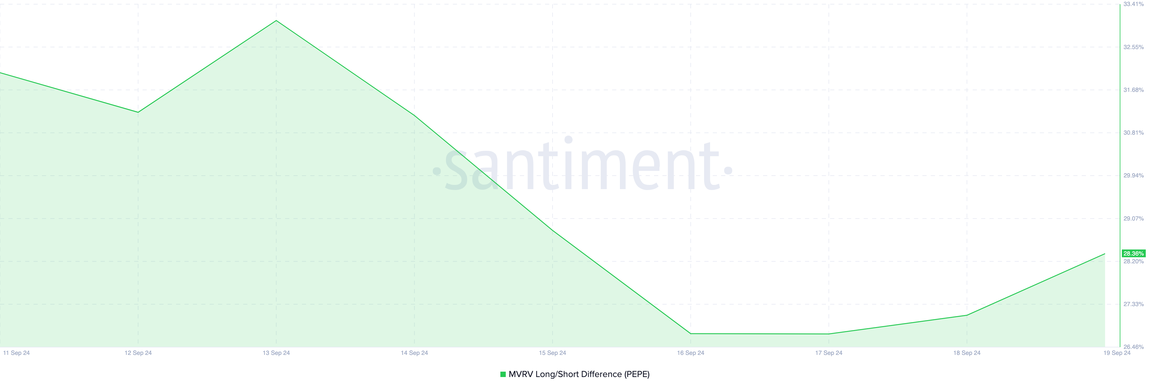 Tra il 13 e il 16 settembre, la differenza lungo/breve del Valore di Mercato al Valore Realizzato (MVRV) della criptovaluta è scesa dal 33% al 26%. Questo calo ha coinciso con il calo del prezzo di PEPE da 0,0000079 USD a 0,0000071 USD.