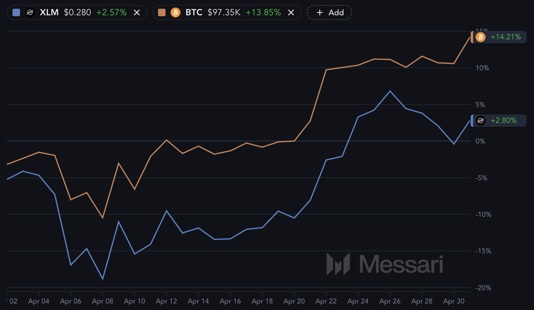 Nell’ultimo mese, Stellar ha seguito da vicino la traiettoria di Bitcoin ma con una performance al rialzo significativamente più debole.