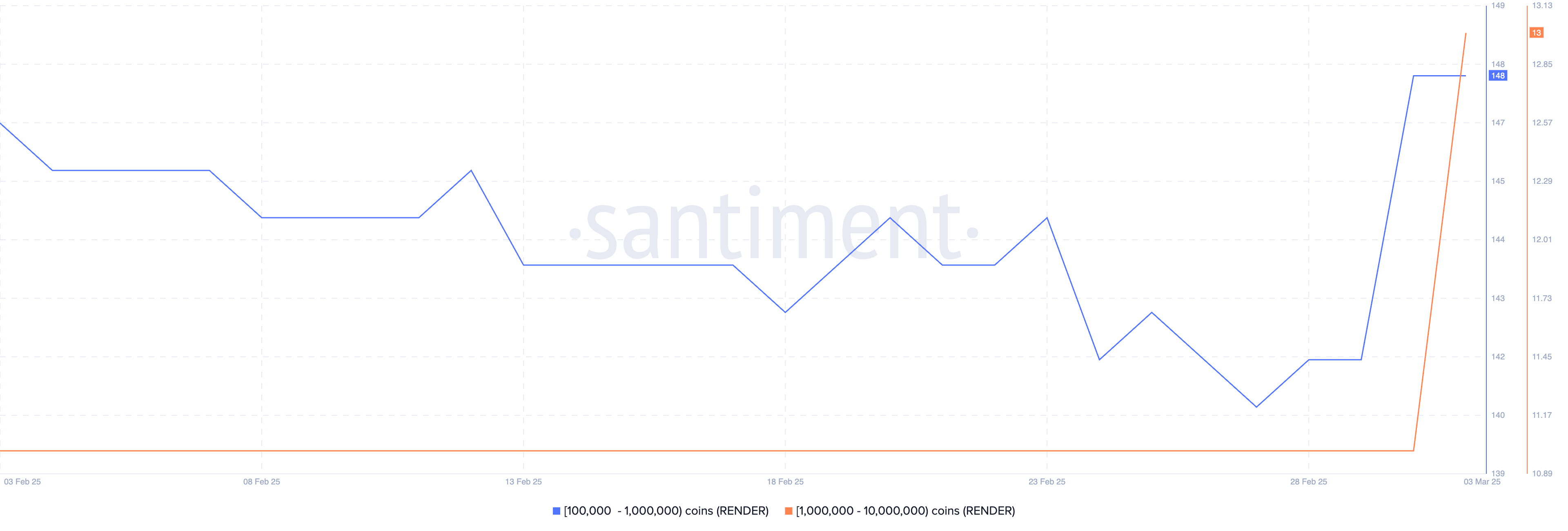 Nonostante il calo, le balene crypto hanno acquistato RENDER negli ultimi giorni, aumentando l’accumulazione. Il numero di portafogli che detengono tra 100.000 e 10 milioni di RENDER è salito da 153 il 1° marzo a 161 ora.