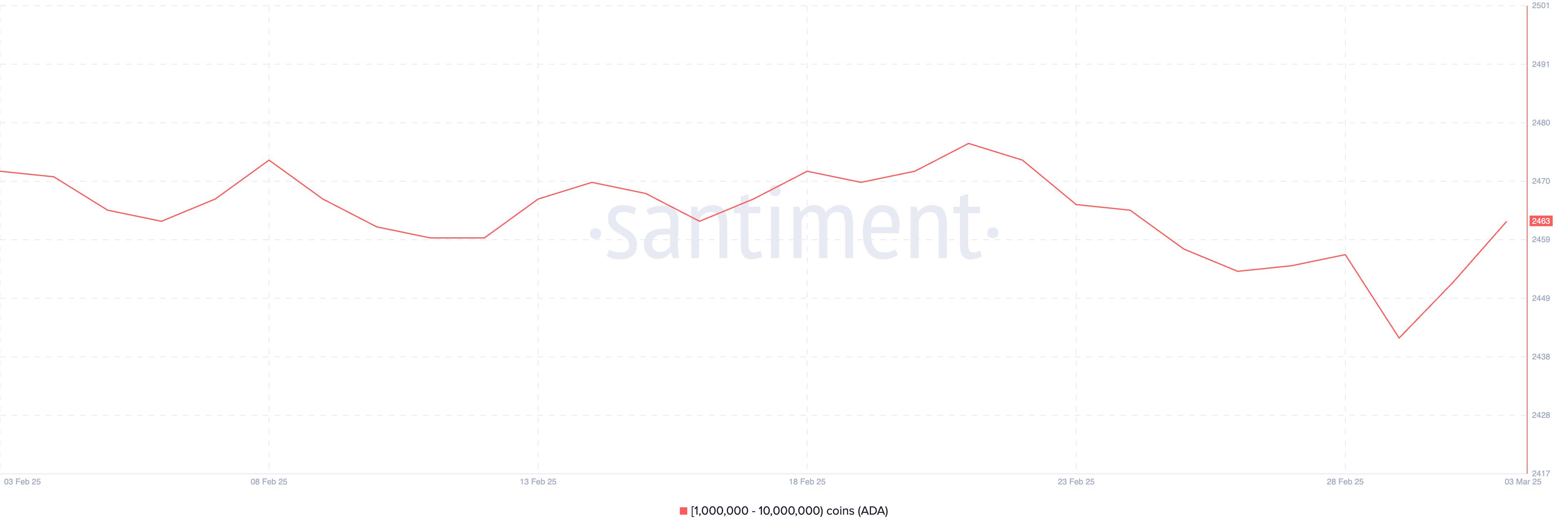 Il numero di balene che detengono tra 1 e 10 milioni di ADA è cresciuto da 2.442 il 1° marzo a 2.464 il 3 marzo. Questo aumento conferma che le balene hanno acquistato più ADA mentre il prezzo scendeva.