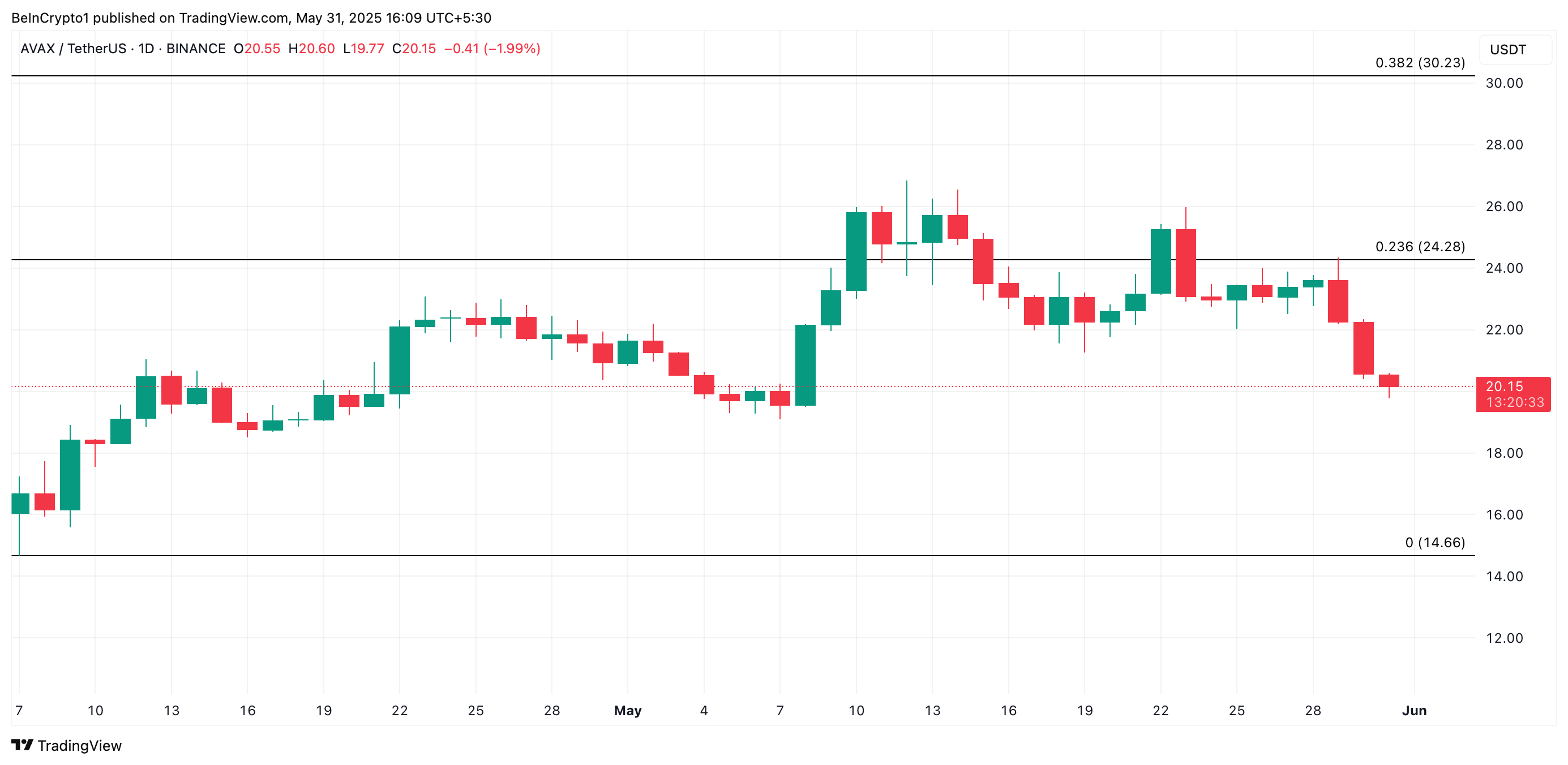 AVAX potrebbe assistere a un rimbalzo e salire a $24,28 se l’accumulo delle balene continua.