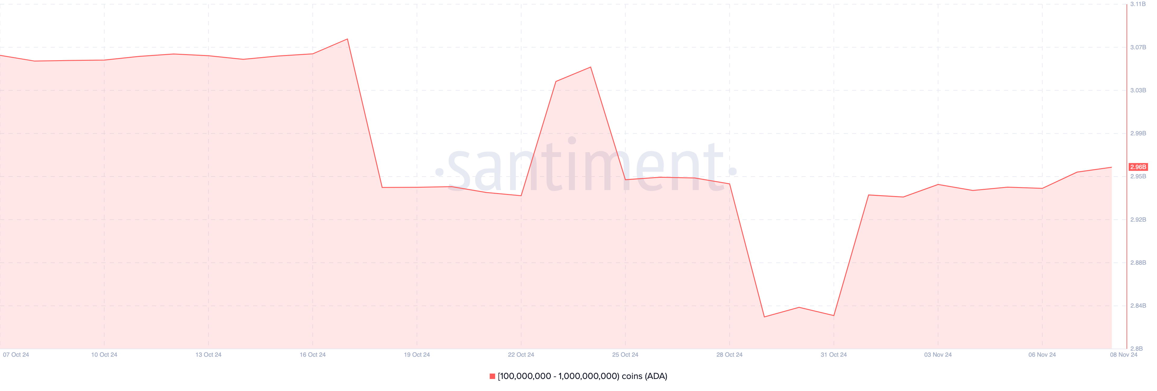 Anche Cardano è un’altra altcoin acquistata dalle whales crypto questa settimana. Secondo Santiment, il saldo degli indirizzi che detengono tra 100 milioni e 1 miliardo di ADA era di 2,83 miliardi il 31 ottobre.