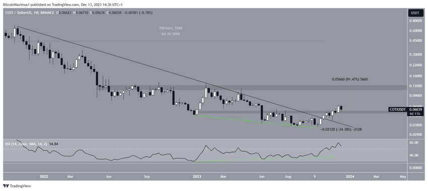 Il prezzo di COTI è aumentato da ottobre, quando era sceso a un nuovo minimo annuale di 0,036 dollari. L’aumento è stato rapido e il prezzo ha superato la linea di tendenza di resistenza discendente all’inizio di novembre.