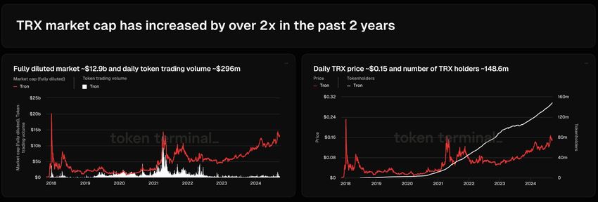 Il token nativo di TRON, TRX, ha anche sperimentato una crescita impressionante. Token Terminal ha riportato che negli ultimi due anni, la capitalizzazione di mercato di TRX è più che raddoppiata.