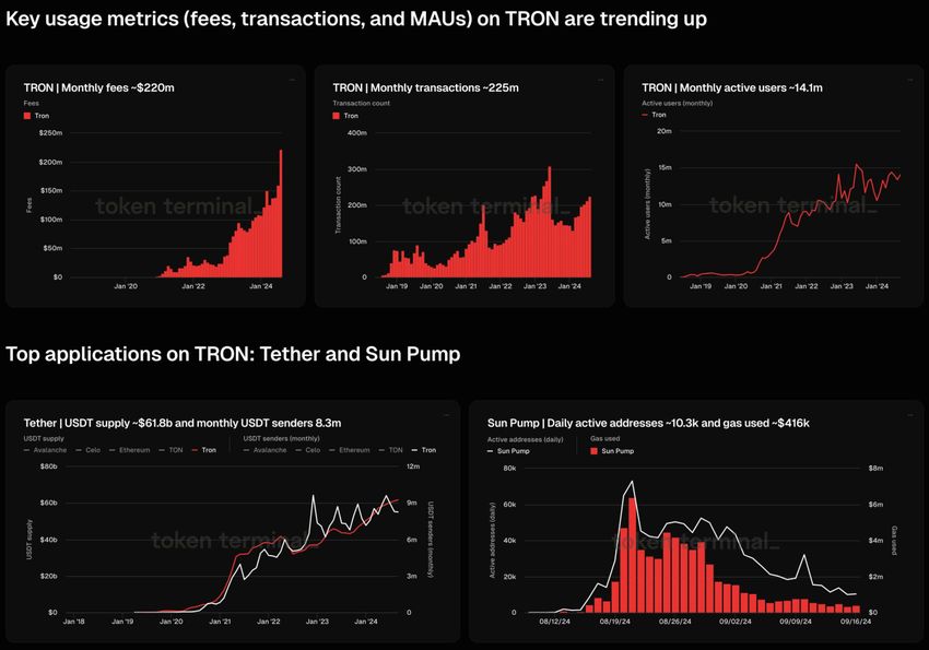 Il rapporto ha rivelato che Tether (USDT) e SunPump sono diventate applicazioni chiave sulla blockchain, fungendo da principali motori di questa crescita.