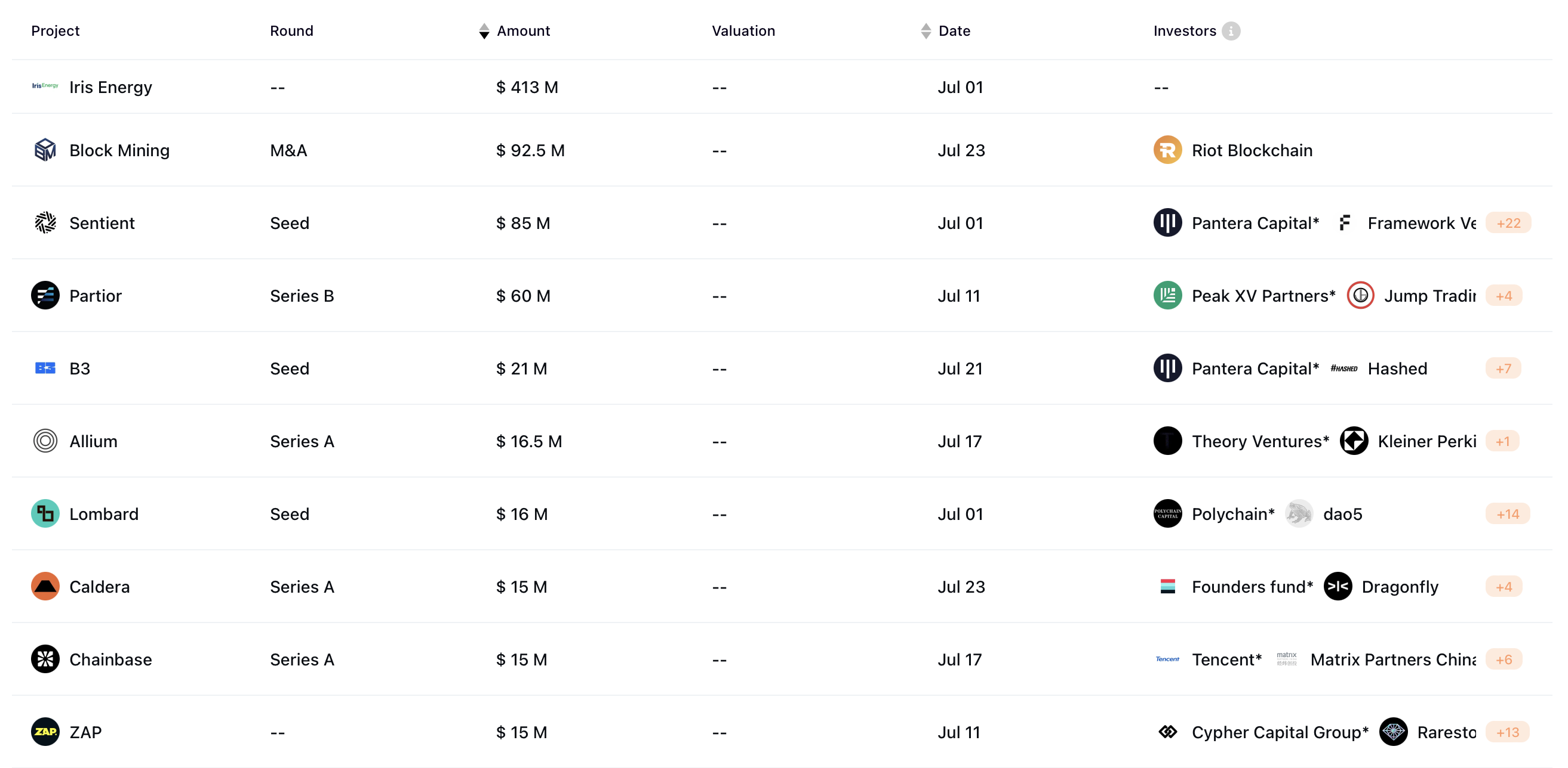 L’attività di raccolta fondi ha registrato un notevole cambiamento nel mese di luglio. RootData mostra 113 investimenti di capitale di rischio in criptovalute resi pubblici, con un aumento del 12% rispetto ai 99 di giugno.