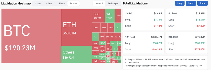 Di conseguenza, un totale di 89.163 scambi è stato spazzato via. Gli scambi di Bitcoin sono stati i più colpiti, con 190 milioni di dollari liquidati, seguiti da Ethereum con 68 milioni di dollari.