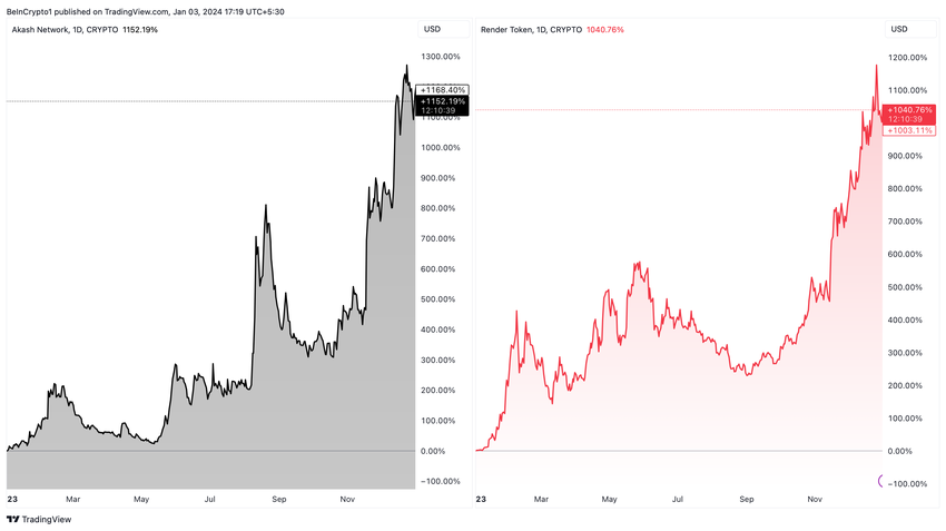 Akash Network (AKT) e Render (RNDR) sono stati tra i maggiori rendimenti. In effetti, il prezzo di AKT è salito del 1.170% nel 2023, mentre RNDR ha visto il suo valore di mercato aumentare di oltre il 1.000%.