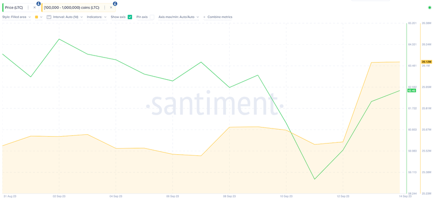 Il grafico di Santiment qui sotto mostra che le balene che detengono da 100.000 a 1 milione di monete LTC hanno intensificato la loro pressione di acquisto una volta che il prezzo ha raggiunto i 58 dollari il 12 settembre.