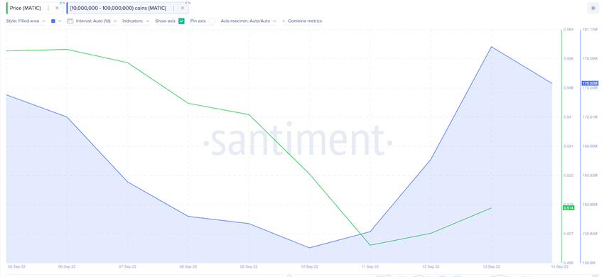 Questa settimana, però, un gruppo di investitori “whale” ha effettuato tempestivi afflussi di capitale, innescando un immediato rimbalzo verso 0,52 dollari. I dati sulla catena mostrano che le balene che detengono 10 milioni e 1 miliardo di MATIC hanno acquistato 17 milioni di nuove monete da quando il prezzo di MATIC è sceso sotto 0,53 dollari il 10 settembre.