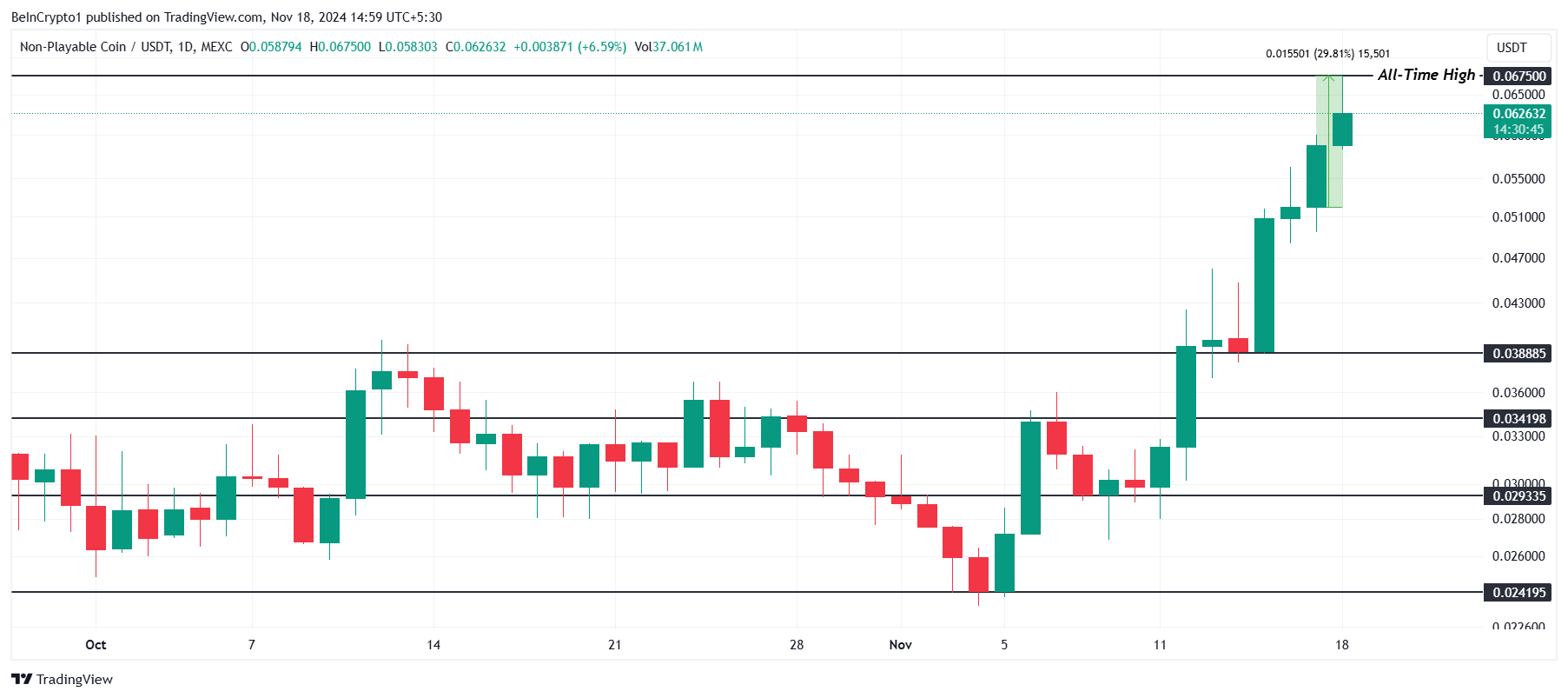 NPC è attualmente scambiato a 0,062 USD, segnando un aumento intra-giornaliero del 30% e raggiungendo un massimo storico di 0,067 USD. L’importante impennata riflette una forte domanda di mercato, posizionando l’altcoin come uno dei migliori performer.