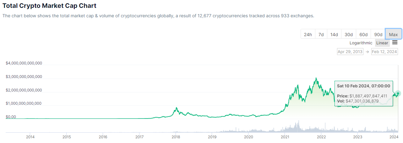 I mercati delle criptovalute stanno raggiungendo la più alta capitalizzazione totale dall’aprile 2022. La cifra ha toccato i 1.900 miliardi di dollari dopo un guadagno dell’1% durante la sessione di trading asiatica di lunedì mattina.