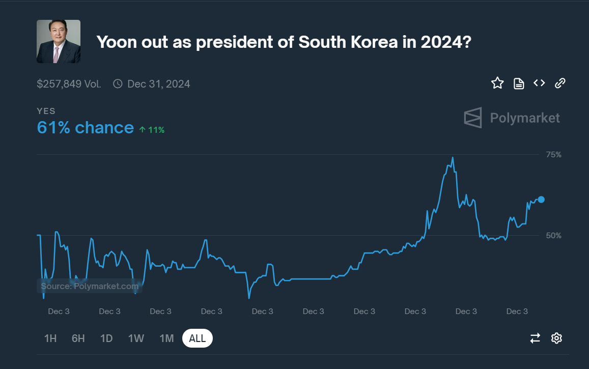 L’incertezza politica si è riversata nei mercati di previsione crypto, con Polymarket che ha lanciato un pool di scommesse sulla potenziale dimissione del presidente Yoon. Il mercato chiede se Yoon lascerà l’incarico tra il 2 e il 31 dicembre 2024. Alle 17:30 UTC di mercoledì, sono state piazzate scommesse per circa 257 000 USD, con una probabilità del 61% assegnata alle dimissioni di Yoon.
