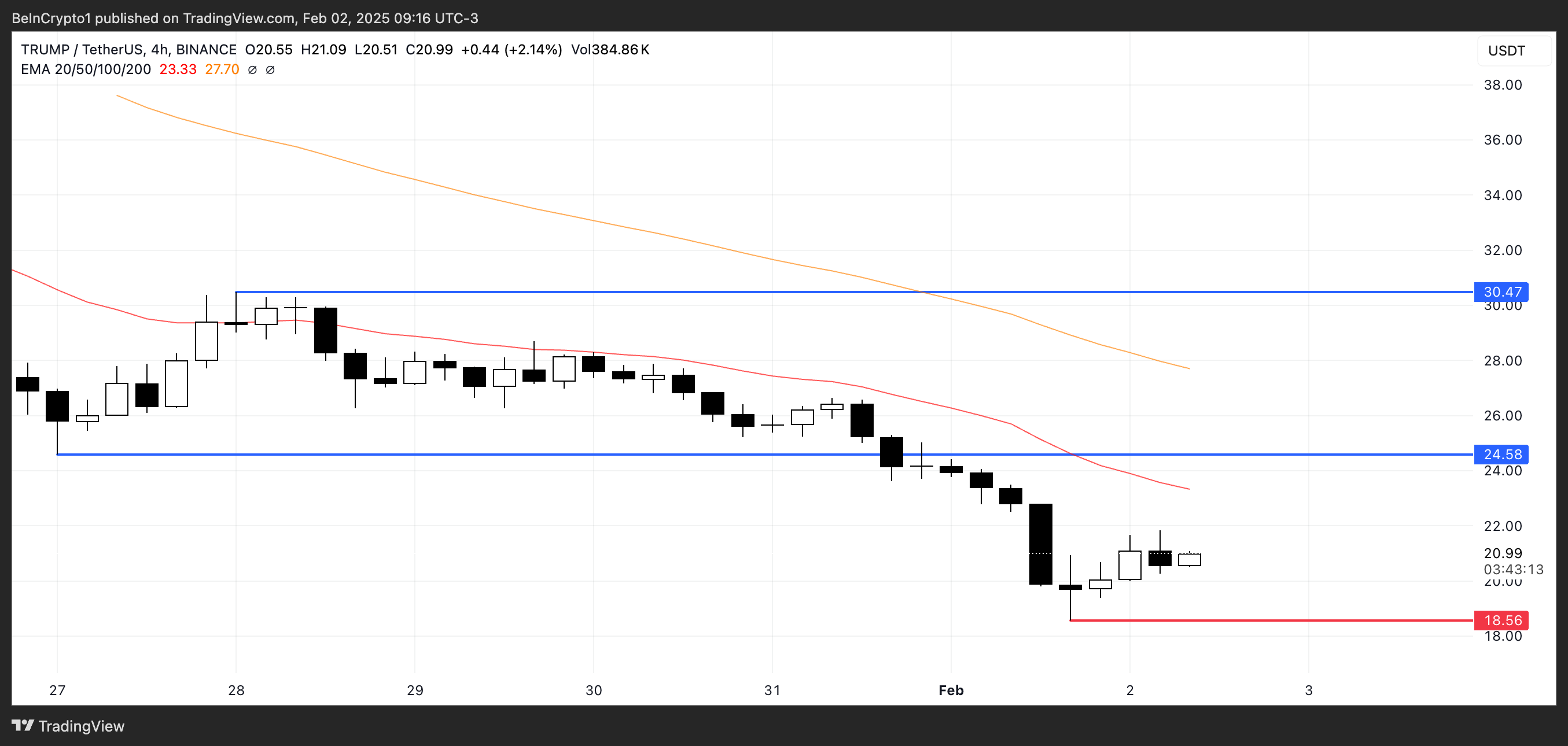 D’altra parte, se il prezzo di TRUMP non riesce a stabilire un trend rialzista e i venditori mantengono il controllo, la pressione al ribasso potrebbe intensificarsi. Una mancanza di forza d’acquisto potrebbe spingere il prezzo più in basso, con 18.56 USD che funge da prossimo livello di supporto principale.