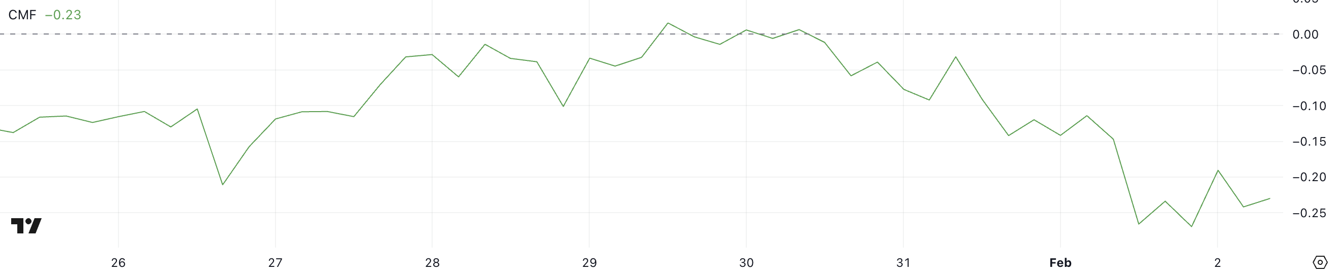 Sponsored SponsoredIl Chaikin Money Flow (CMF) è un indicatore che misura l’accumulazione e la distribuzione di capitale basato su prezzo e volume in un periodo specificato. Varia da -1 a 1, con valori positivi che indicano una forte pressione d’acquisto e valori negativi che suggeriscono una pressione di vendita persistente.