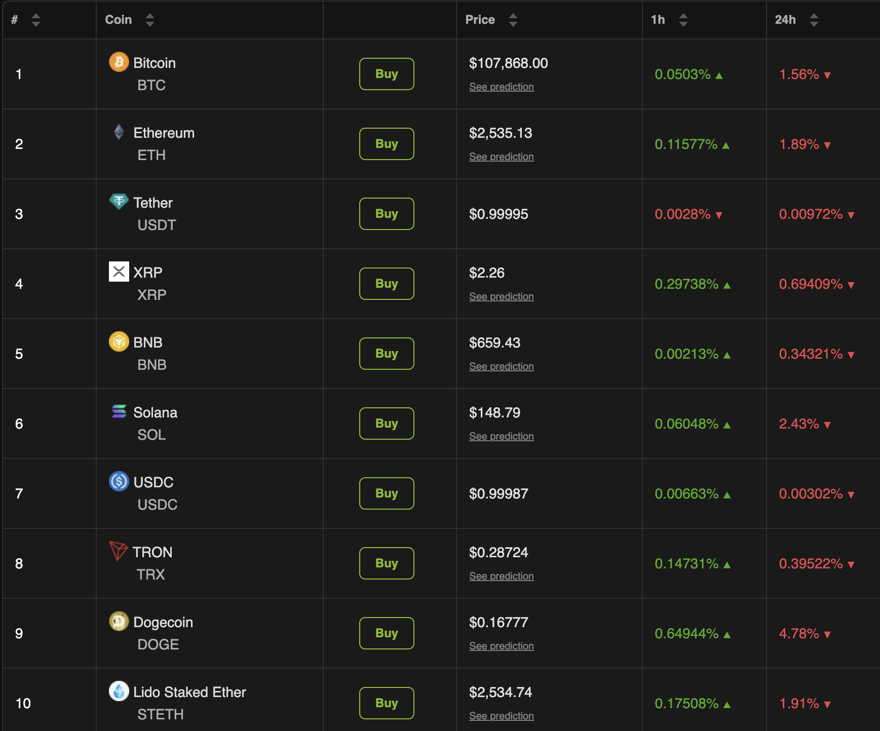 Bitcoin (BTC) è sceso dell’1,56% al di sotto della soglia dei $108.000. Al momento della scrittura, era scambiato a $107.688. Ethereum (ETH) è crollato dell’1,89% a un valore di $2.535 al momento della pubblicazione. Dogecoin (DOGE) ha registrato la perdita maggiore del 4,78%.