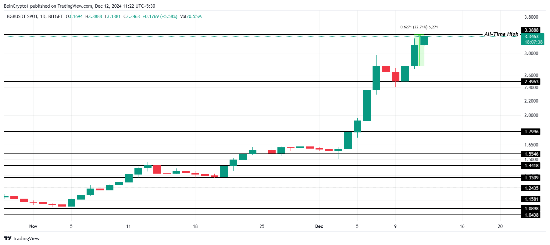 BGB ha mantenuto la sua impressionante serie di nuovi massimi storici (ATH) giornalieri, con l’ultimo picco che ha raggiunto 3.38 USD dopo un aumento del 22% nelle ultime 24 ore. Questa crescita costante evidenzia una forte domanda e interesse degli investitori, suggerendo che l’altcoin rimane un attore chiave nell’attuale rally di mercato.