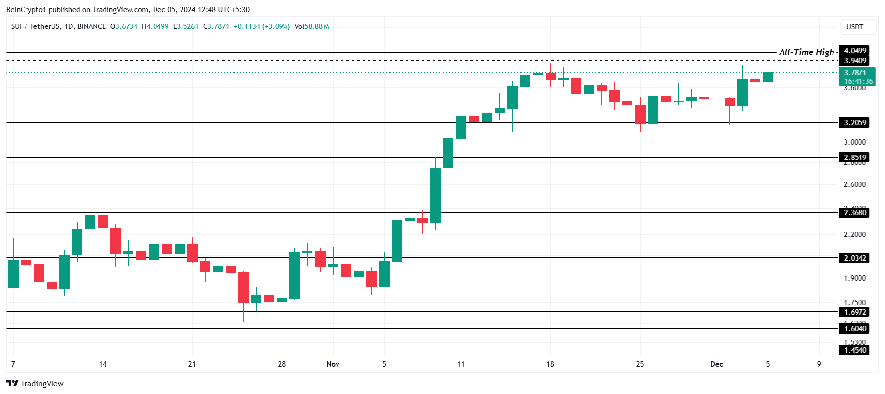 Un altro token crypto, SUI, ha raggiunto un nuovo massimo storico (ATH) di 4.04 USD, segnando il suo secondo ATH nel mese scorso. L’altcoin ha stabilito un supporto critico a 3.20 USD, da cui è recentemente rimbalzato. Questo mostra una forte resilienza e suggerisce che SUI è in una posizione forte per la crescita futura.