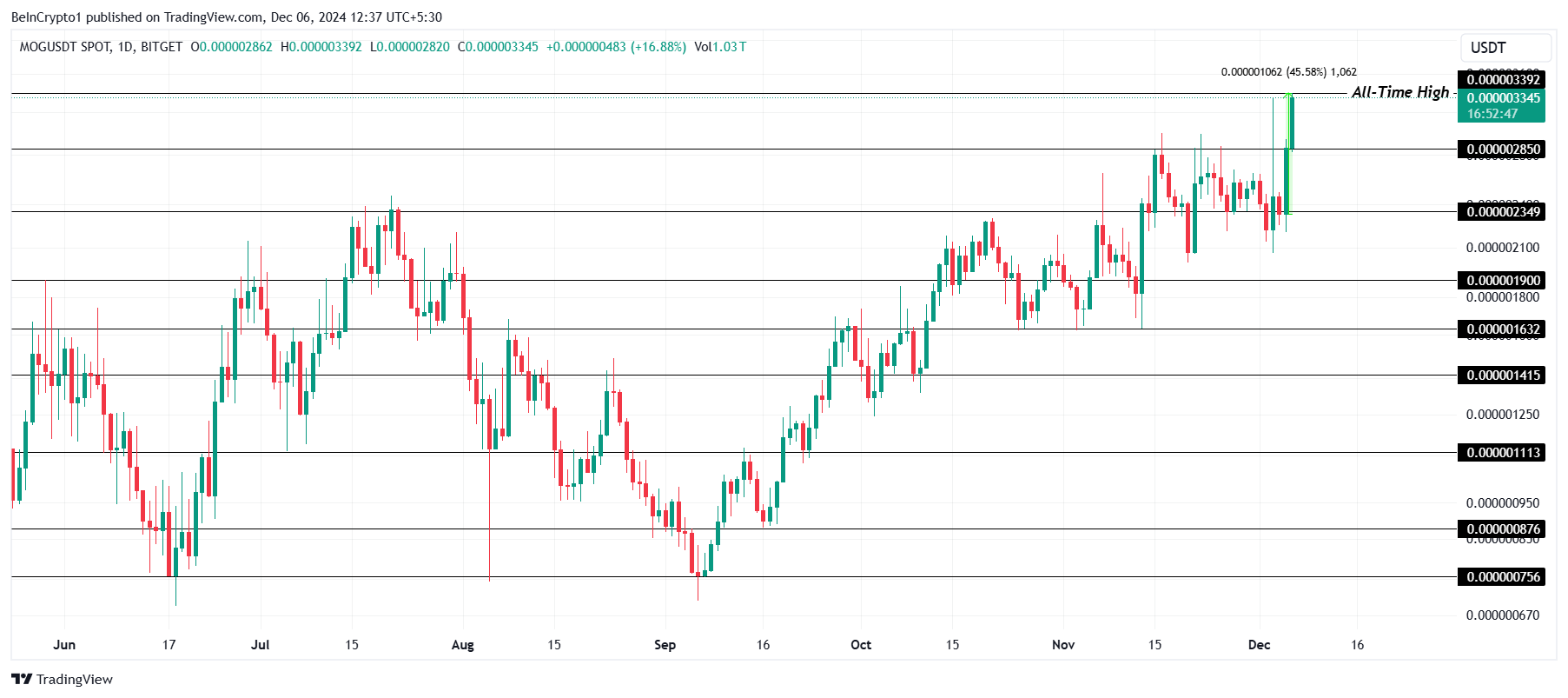 MOG è aumentato del 45% nelle ultime 24 ore, raggiungendo un nuovo massimo storico (ATH) di 0.000003392 USD. Questo segna il secondo ATH raggiunto questa settimana, spinto dal crescente interesse degli investitori nel memecoin. Il momentum continua a crescere mentre MOG attira un’attenzione significativa dalla comunità crypto.