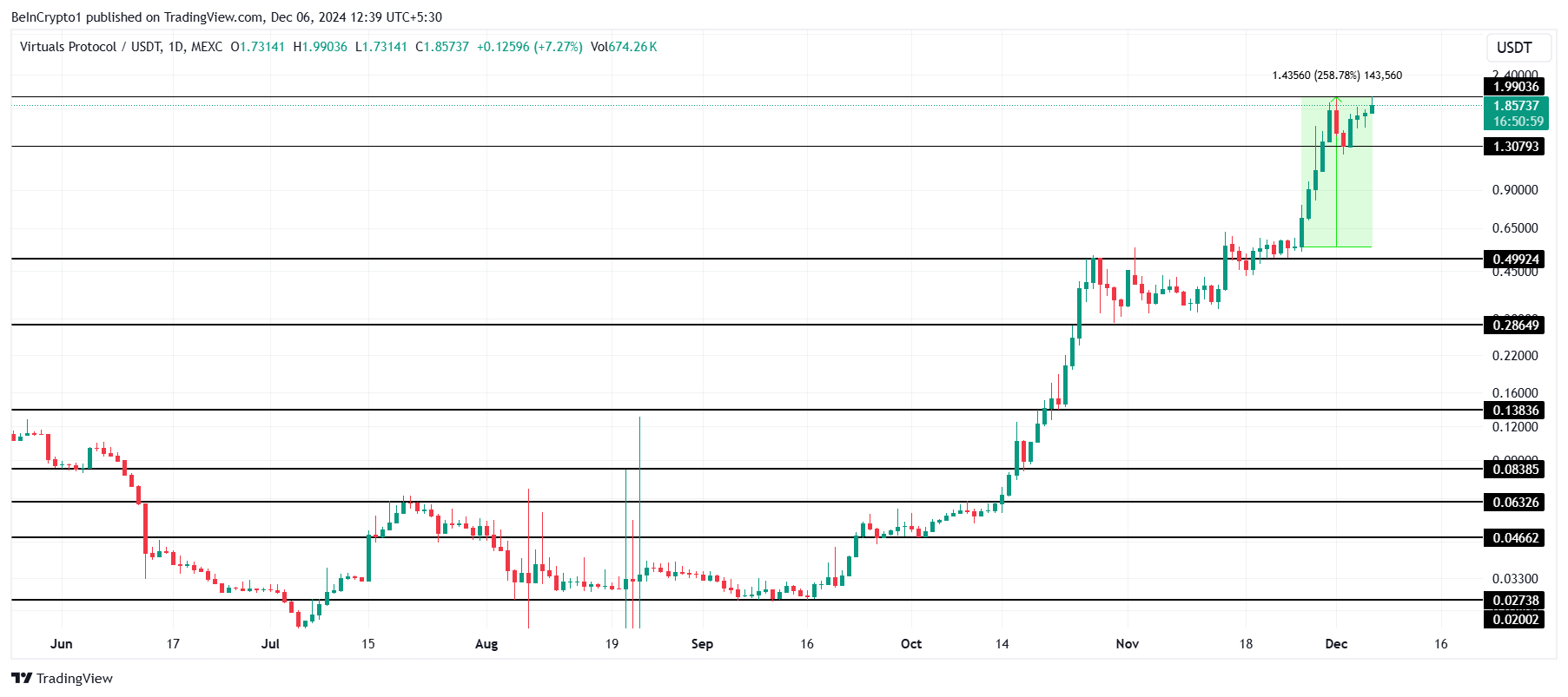 VIRTUAL è aumentato del 258% negli ultimi dieci giorni, con il prezzo che ha raggiunto un nuovo massimo storico (ATH) di 1.99 USD. Questo segna il secondo ATH raggiunto questa settimana, riflettendo un forte entusiasmo del mercato e un rinnovato interesse nell’altcoin.