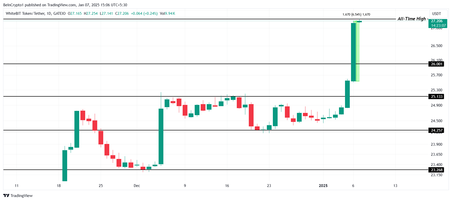 Il prezzo di WBT è aumentato del 6.5% nelle ultime 24 ore, formando un nuovo massimo storico di 27.25 USD. Questo segna il secondo ATH in soli due giorni, riflettendo un forte ottimismo degli investitori e un momentum di mercato.