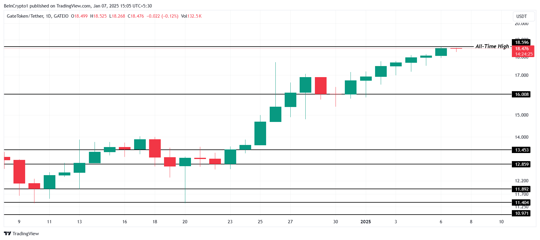 Un altro token crypto, il prezzo di GT ha raggiunto un nuovo massimo storico di 18.59 USD oggi, continuando la sua impressionante serie. La costante tendenza al rialzo ha aiutato l’altcoin a evitare una significativa volatilità, riflettendo stabilità nel suo percorso di crescita.