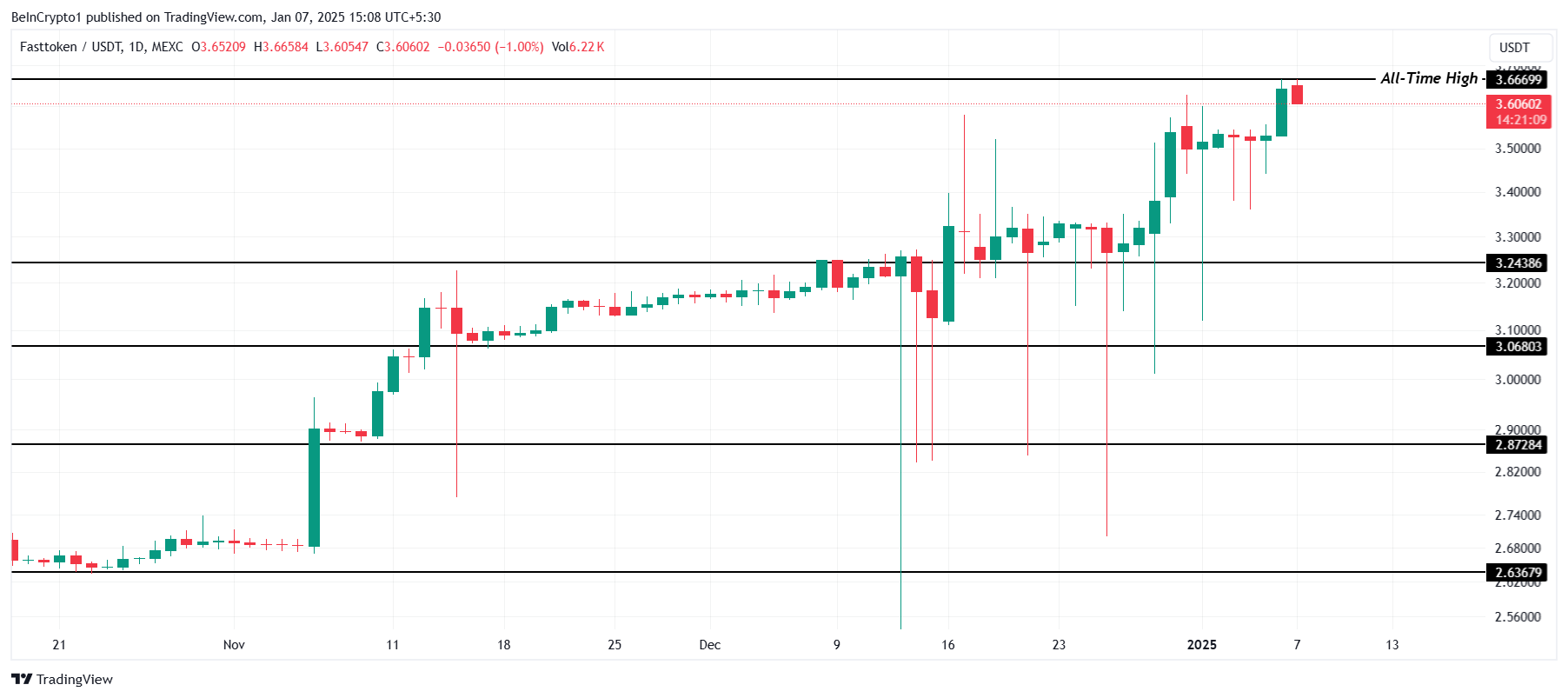 Il prezzo di FTN ha raggiunto un nuovo massimo storico di 3.66 USD durante il trading intra-giornaliero prima di ritirarsi leggermente a 3.60 USD. Questo traguardo segna un altro passo significativo nella recente tendenza al rialzo dell’altcoin, attirando l’attenzione degli investitori in cerca di opportunità di crescita.