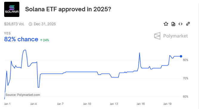 Oltre all’ottimismo per l’inaugurazione di Trump, i mercati crypto sperano anche che la nuova amministrazione approvi un ETF di Solana mentre si avvicina la scadenza per l’approvazione. Come riportato da BeInCrypto, Polymarket dà all’ETF di Solana una probabilità di approvazione dell’82% mentre la nuova amministrazione entra in carica. Questo segna una svolta spettacolare, passando dal 3% all’82% in meno di quattro mesi.