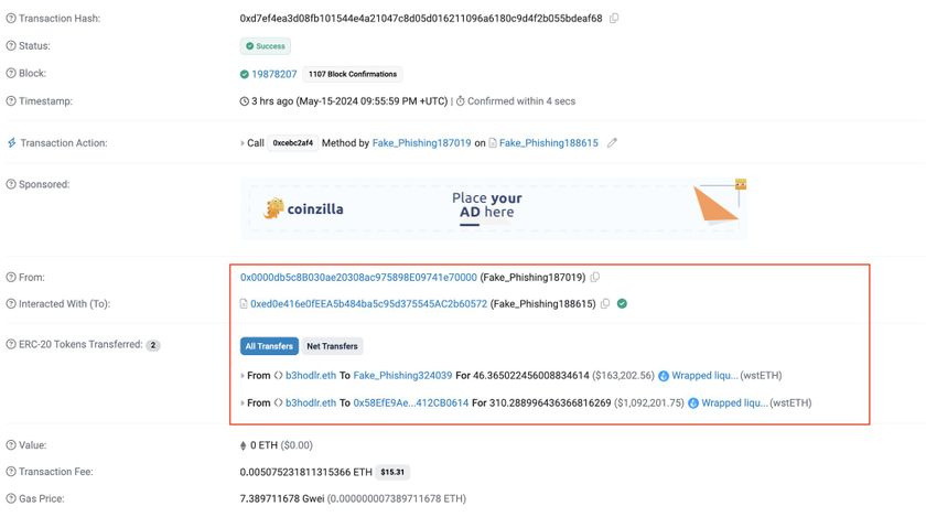 Un attacco di phishing ha compromesso il wallet b3hodlr.eth. Un malintenzionato ha rubato circa 356,7 Wrapped Liquid Staked ETH (wstETH). Questo furto ha un valore di circa 1,26 milioni di dollari all’attuale prezzo di mercato.